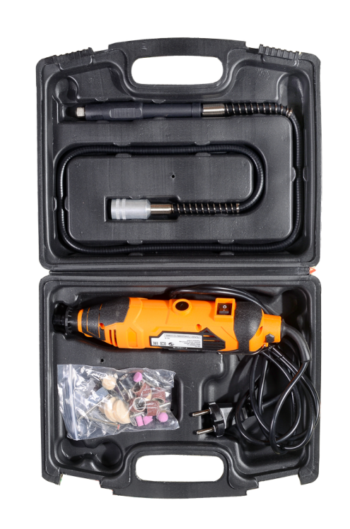 - Электрогравер поставляется в пластиковом кейсе, в котором его удобно хранить и перемещать. Кроме самого устройства и гибкого вала в этом кейсе можно найти набор насадок и ключей.