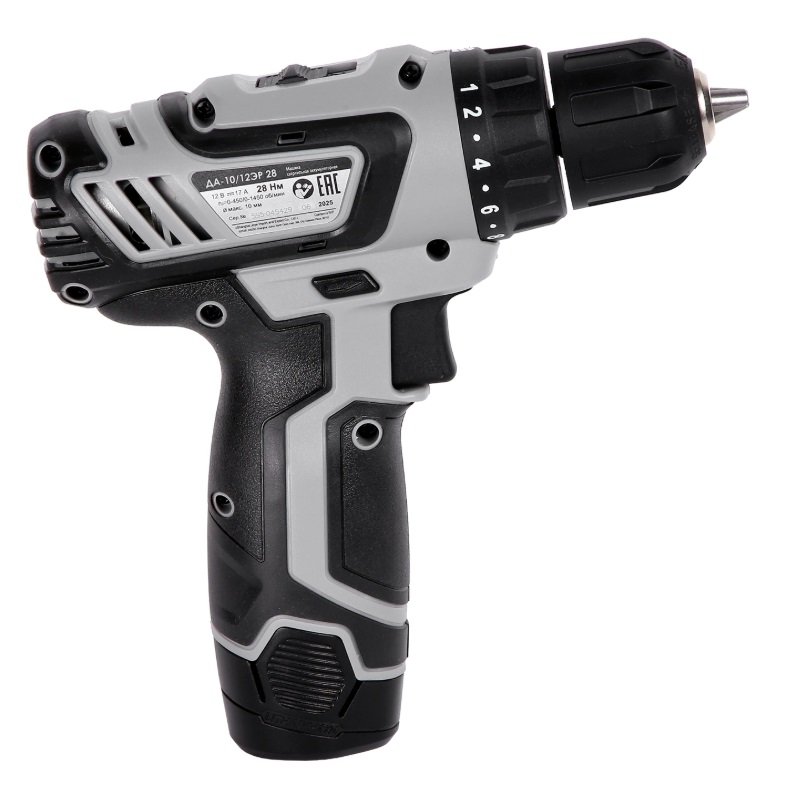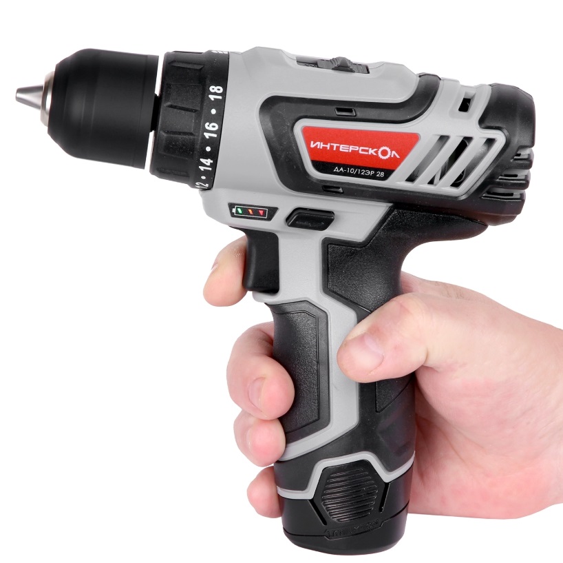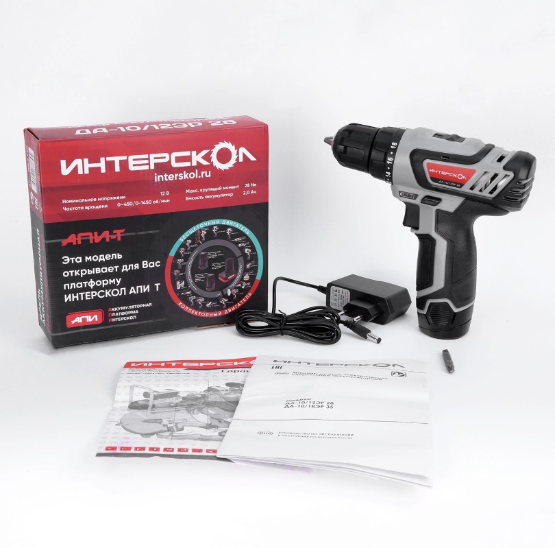 Двухскоростная аккумуляторная дрель-шуруповерт ИНТЕРСКОЛ ДА-10/12ЭР 28 комплектуется высококачественными литийионными (Li-ion) аккумуляторными батареями единой универсальной платформы АПИ Т 12 В туннельного типа (размещаются внутри рукоятки инструмента), характеризующимися высокой энергоемкостью, практическим отсутствием саморазряда и эффекта памяти. Это позволяет сразу же приступить к работе даже после продолжительного хранения (аккумуляторы сохраняют заряд на протяжении долгого времени), а при необходимости в любой момент поставить батарею на подзарядку.