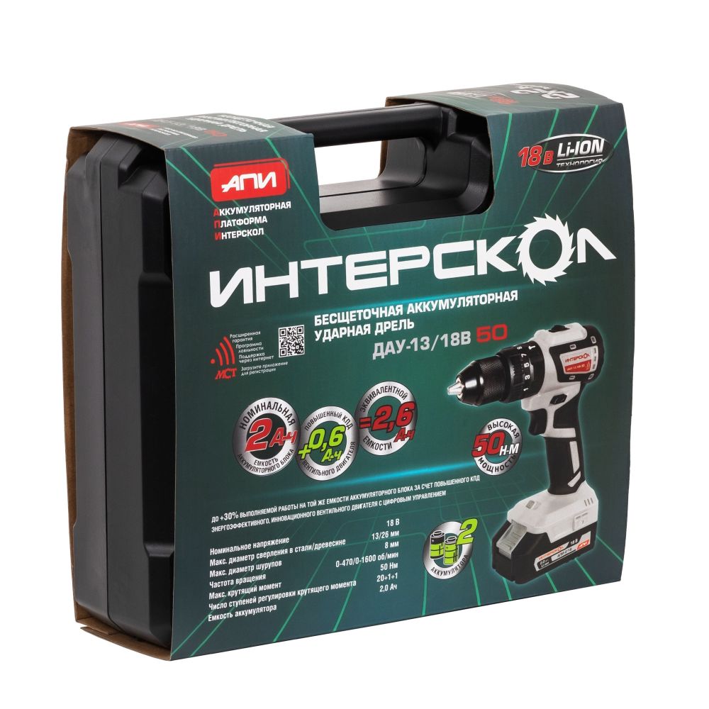 Аккумуляторная дрель-шуруповерт ударная ИНТЕРСКОЛ ДАУ-13/18В 50, 2*2,0Ач, Li-ion АПИ, ЗУ, БЗП 13мм, 45Нм, б/щ, 2 аккум, кейс
