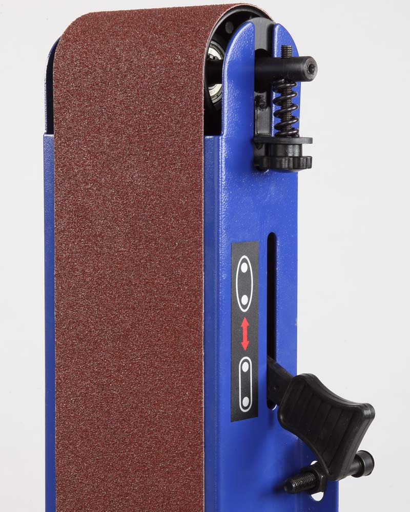 Рабочий стол – алюминиевый с П-образным пазом под установку углового упора, он используется как при шлифовании лентой, так и диском. Угол наклона стола от 0 до 60 град. Блок шлифования лентой – поворотный.