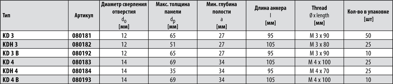 - Длинная резьбовая шпилька раскрывающихся дюбелей KD и KDH позволяет использовать их с листовыми материалами различной толщины и обеспечивает максимальную гибкость в использовании метиза.