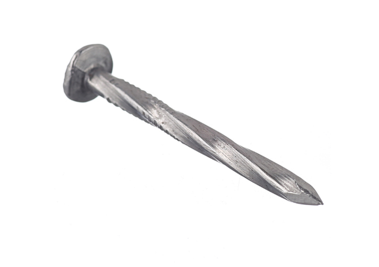 Гвоздь представляет собой длинный и прямой стержень квадратного сечения, завинченный по спирали, с небольшими неровностями рядом со шляпкой, что улучшает качество соединения.
