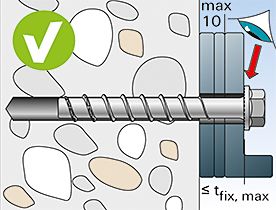 - Шуруп для бетона устанавливается в максимально короткие сроки за счет продуманного процесса установки в один этап в заранее подготовленное отверстие. Установка шурупа по бетону Фишер не требует особых навыков и не требует дорогого оборудования. Достаточно иметь перфоратор для бурения отверстия и шуруповерт, дрель или перфоратор для вкручивания шурупа в бетон.