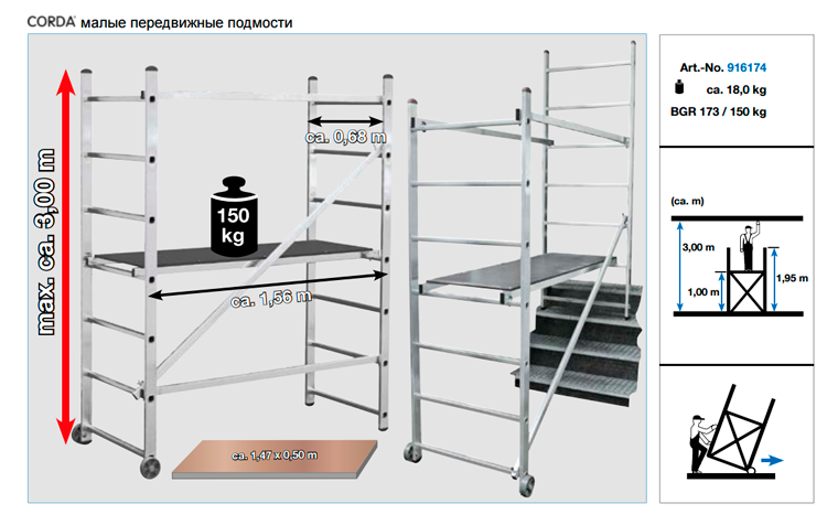 Подмости передвижные монтажные, рабочая высота 3м, высота площадки 1м, нагрузка 150 кг CORDA KRAUSE