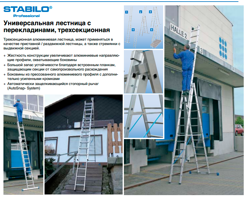 - Может использоваться как двусторонняя стремянка, стремянка с выдвижной секцией, как выдвижная и приставная лестница