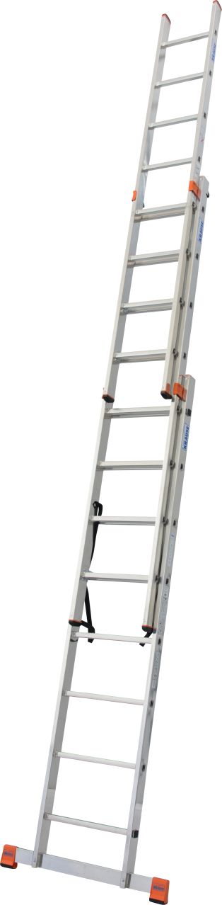 Трехсекционная универсальная лестница используется как приставная или выдвижная лестница, а так же как стремянка с выдвижной частью.