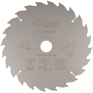 Диск пильный 250х1,8/2,6х32/30/25,4/20 мм 24Т по дереву, с тефлоновым покрытием, CUTOP Profi