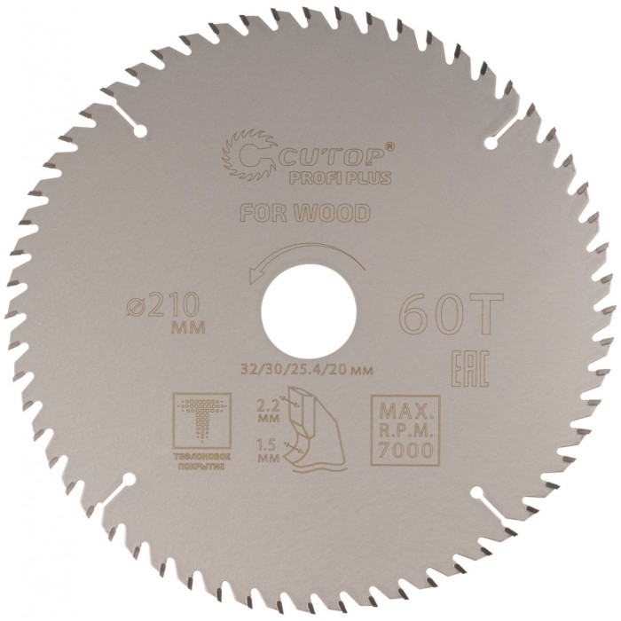 Диск пильный 210х1,5/2,2х32/30/25,4/20 мм 60Т по дереву, с тефлоновым покрытием, CUTOP Profi