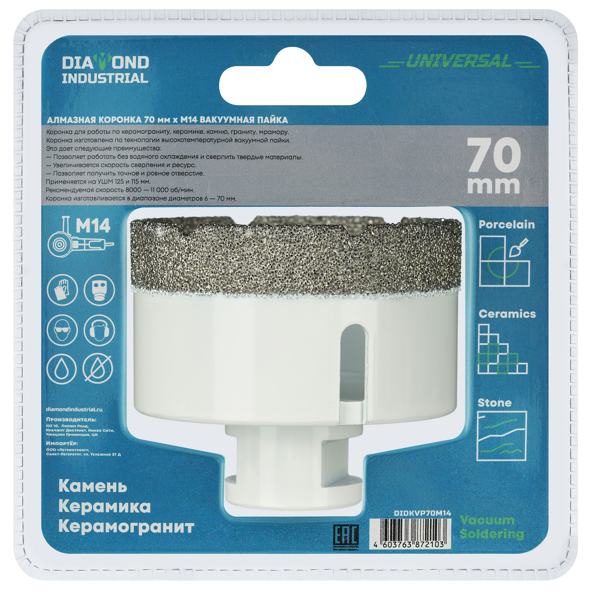 Коронка алмазная по керамике и керамограниту 70 мм/M14 для УШМ, Diamond Industrial