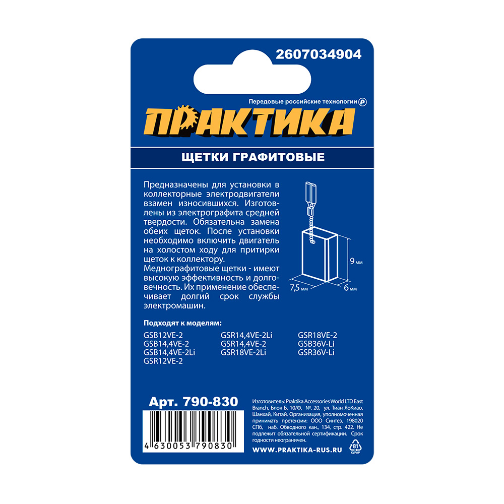 Щетки графитовые для BOSCH №2607034904 с пружиной (6x7,5x9 мм), ПРАКТИКА