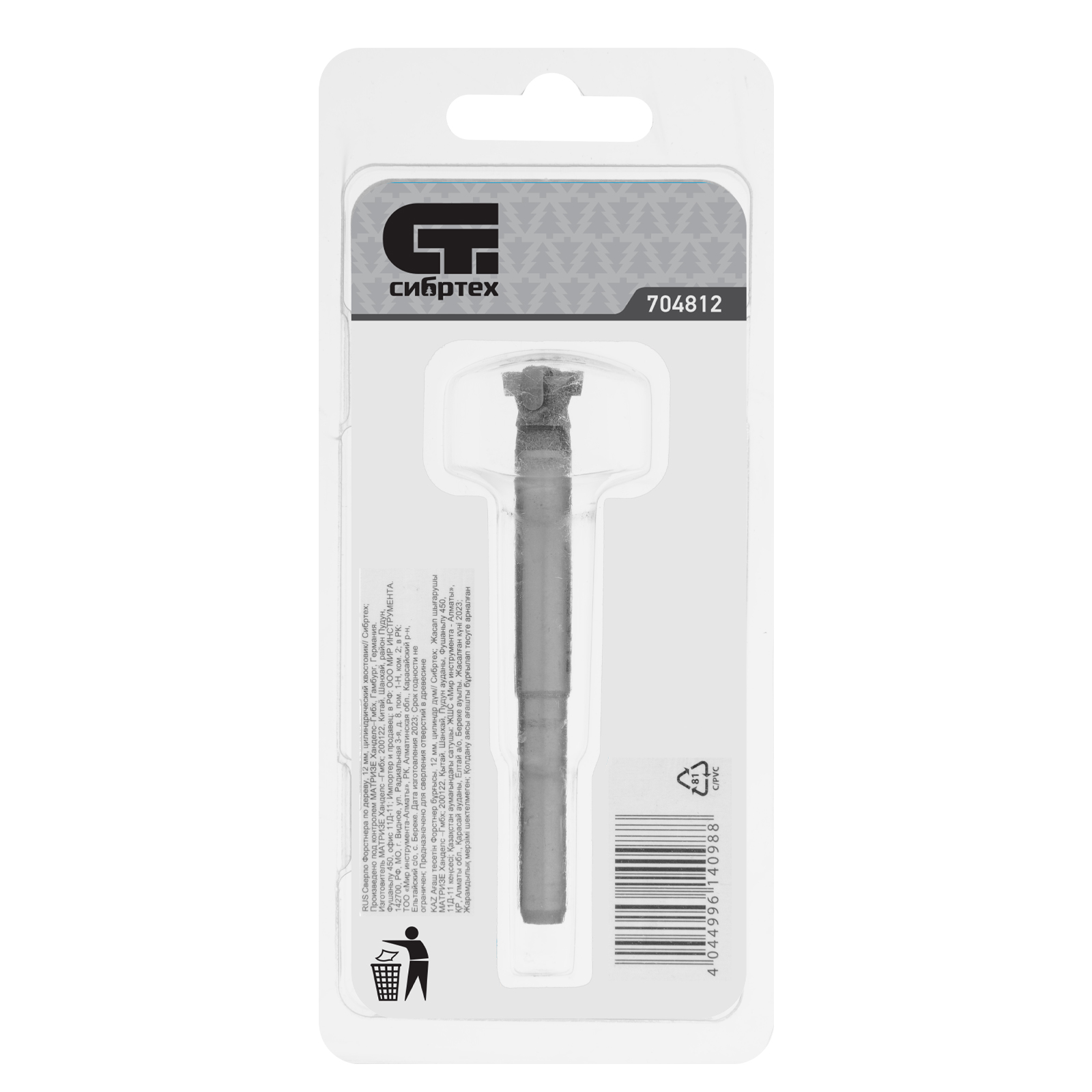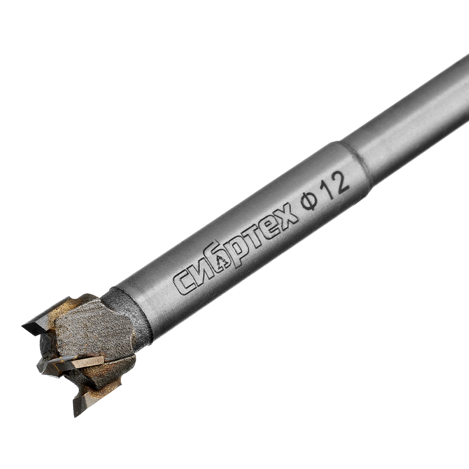 Сверло Форстнера по дереву Сибртех с цилиндрическим хвостовиком, используется для получения глухих отверстий диаметром 12 мм в древесине, ДСП, ДВП и других материалах.