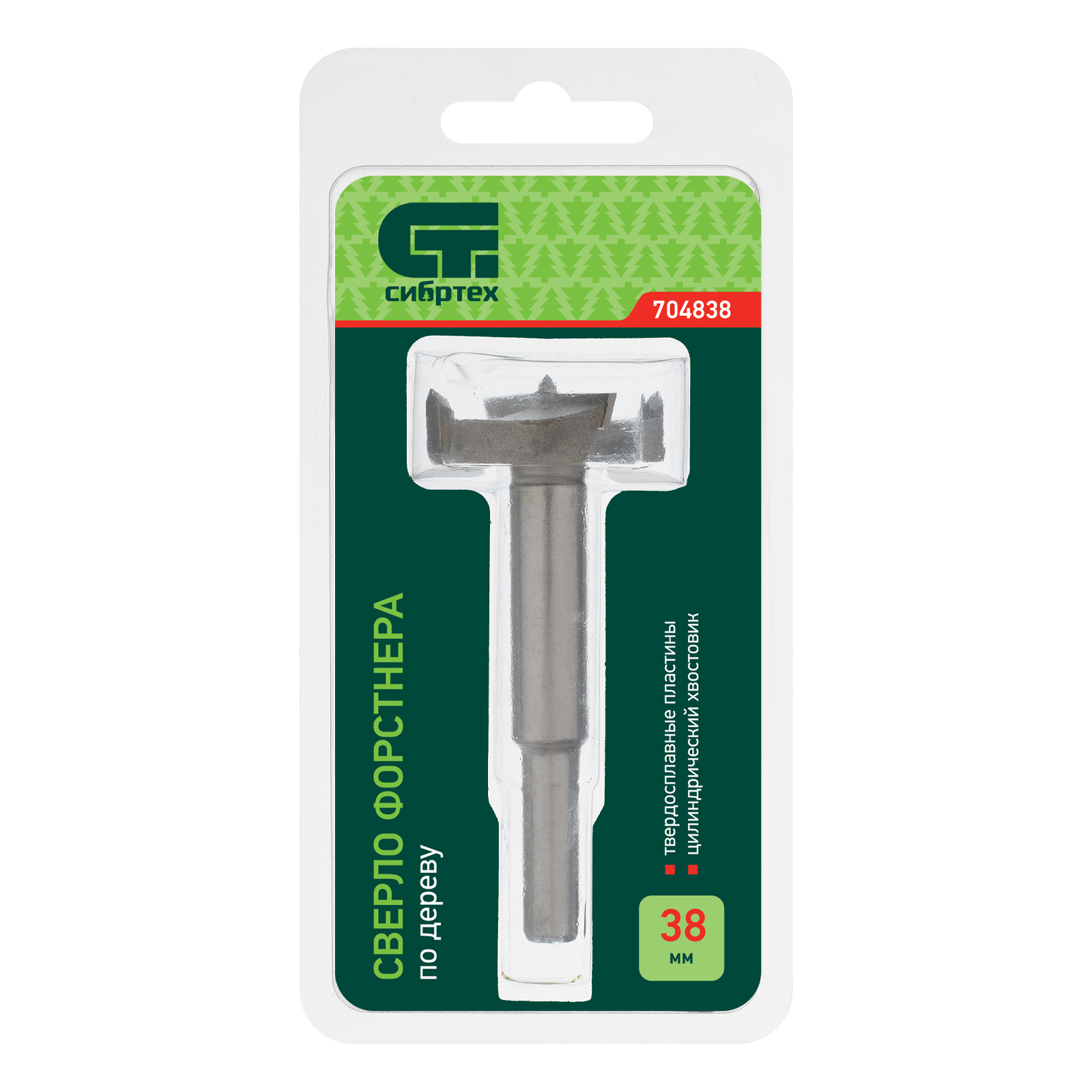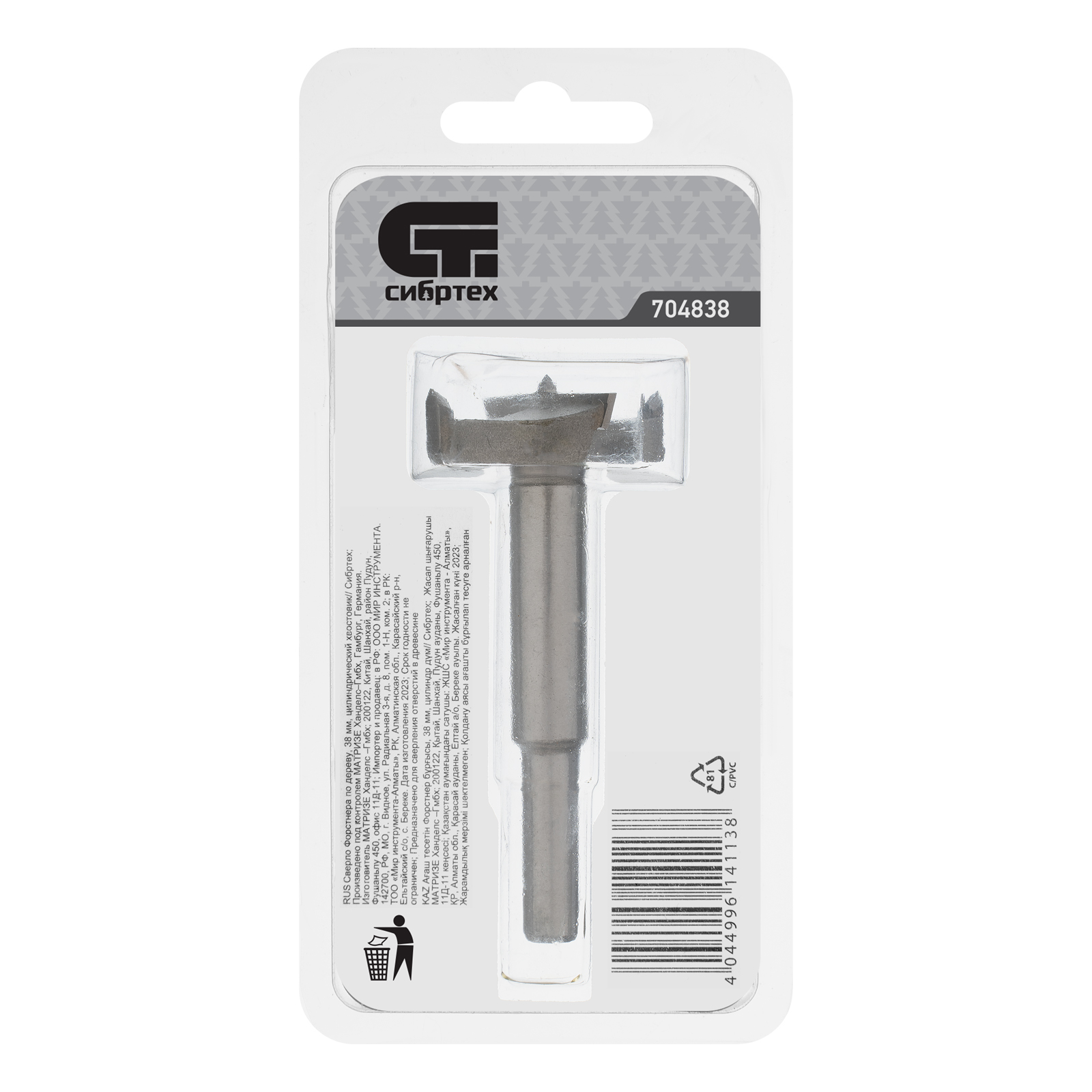 Сверло Форстнера по дереву Сибртех с цилиндрическим хвостовиком, используется для получения глухих отверстий диаметром 38 мм в древесине, ДСП, ДВП и других материалах.