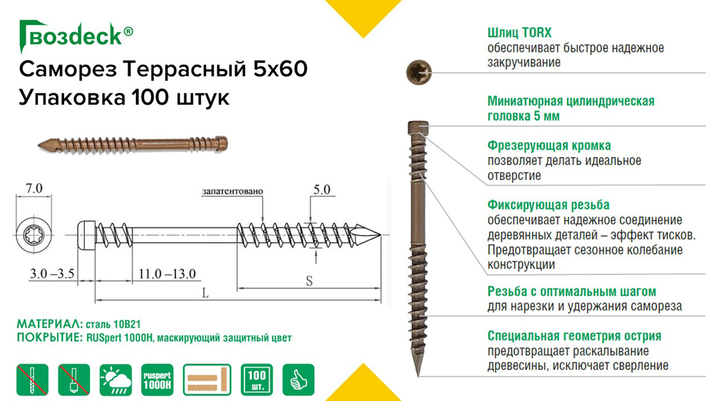 Саморезы для террас с защитным покрытием Русперт 1000 произведены из качественной углеродистой стали, допускается их постоянный контакт с пресной водой и увлажненной древесиной, что делает их незаменимыми при креплении террасных или палубных досок на улице, прибрежных пирсах или в помещениях с повышенной влажностью.
