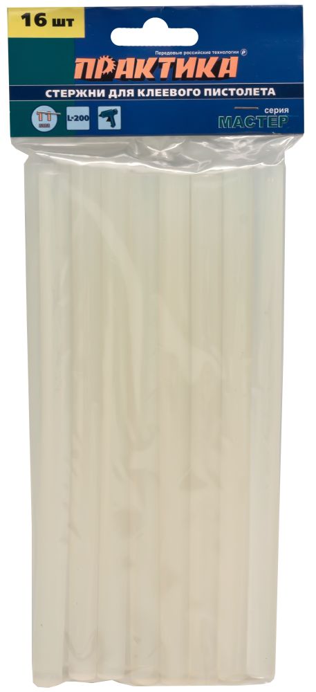 Стержни клеевые 11мм, L= 200мм, белый, 16шт, ПРАКТИКА