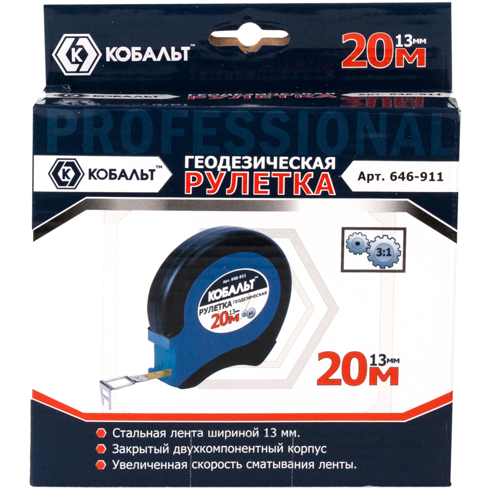Рулетка 20м стальная лента, закрытый корпус, ускоренная перемотка, КОБАЛЬТ