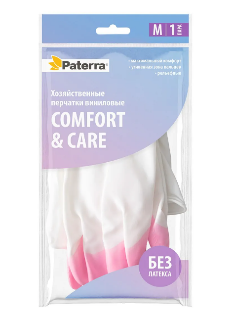 Перчатки резиновые (виниловые) COMFORT and CARE р-р M, усиленная зона пальцев, ПВХ, PATERRA