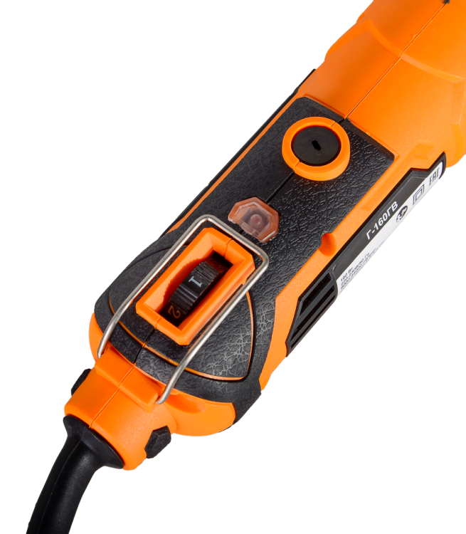 - На корпусе расположена кнопка регулировки скорости вращения вала. Частота вращения может быть от 9000 до 34000 об/мин.