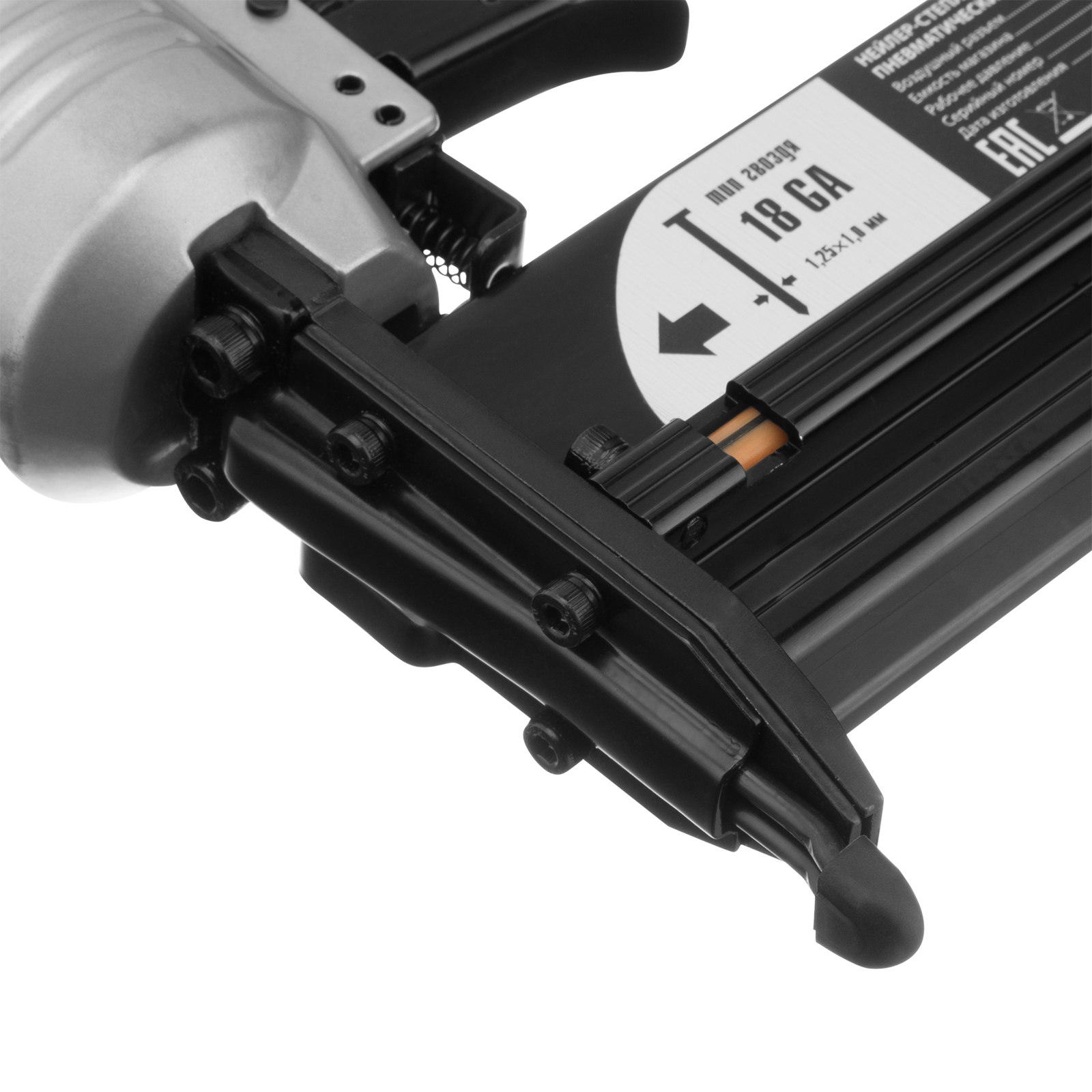 Пневматический нейлер-степлер 3 в 1 Matrix 57427 способен забивать на регулируемую глубину скобы 18 GA и гвозди 18GA и 16GA. Используется для фиксации паркетной доски, фанеры, ДВП, шифера, гипсокартона, ткани и бумаги. Пригодится во время ремонта, а также для сборки мебели и отделочных работ. Расход воздуха составляет 107 л/мин, поэтому нейлер-степлер можно подключать к любому типу компрессоров.