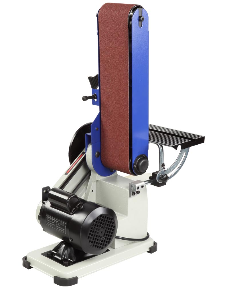 Рабочий стол – алюминиевый с П-образным пазом под установку углового упора, он используется как при шлифовании лентой, так и диском. Угол наклона стола от 0 до 60 град. Блок шлифования лентой – поворотный.