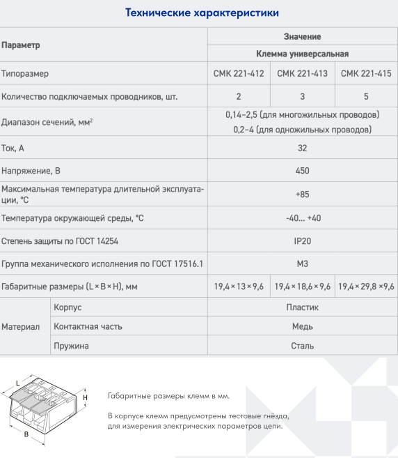 Клеммы универсальные СМК серии 221 предназначены для соединения одножильных и многожильных медных проводников без использования инструмента.