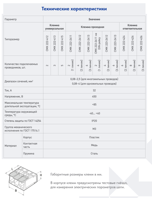 Клеммы СМК серии 222 предназначены для соединения одножильных и многожильных медных