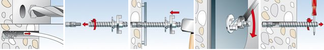 В процессе монтажных работ распорный элемент остаётся в пробуренном отверстии, поэтому в следующий раз, когда мастер будет проводить демонтажные работы, выкрутить распорный элемент не составит особого труда.
