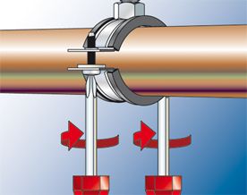 - Установка: хомут состоит из двух половинок, которые соединяются с помощью двусторонних винтов.