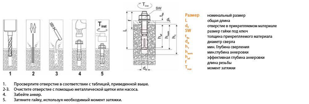 Также его можно устанавливать в плотных основаниях, таких как полнотелый кирпич (макс. ø M8) и натуральный камень. Анкер заранее собран и готов к прямому сквозному монтажу. Может использоваться в сухих помещениях.