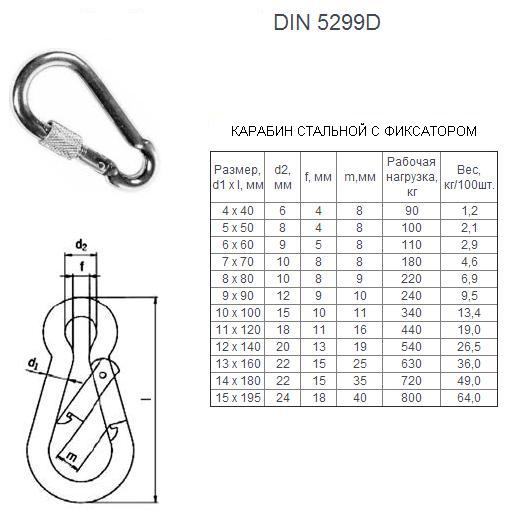 Карабин с фиксатором Din 5299D рекомендуется для быстрого и надежного крепления страховочных цепей, тросов, между собой или к чему-либо.