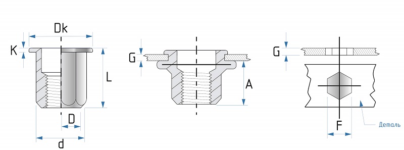Гайка изготавливается в форме шестиугольника с цилиндрическим бортом (буртиком) и может использоваться с более высокой нагрузкой по сравнению с цилиндрической резьбовой заклёпкой.