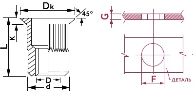 Резьбовая заклепка с потайным бортом отличается от стандартного и уменьшенного бортов особой конусообразной формой бортика для создания надежного малозаметного соединения. Монтаж осуществляется в заранее подготовленное монтажное отверстие. С детали снимается фаска и при помощи зеньковки создается конусное углубление для посадки, что позволяет создать практически единую плоскость детали с готовым резьбовым соединением.