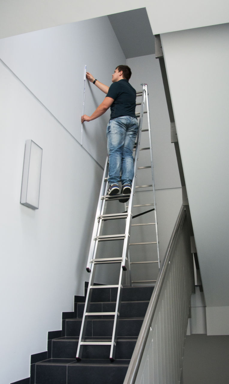 Трехсекционная, универсальная алюминиевая лестница. Может применяться в качестве приставной, раздвижной лестницы и стремянки. Дополнительная функция установки на различных высотах, например лестничных маршах