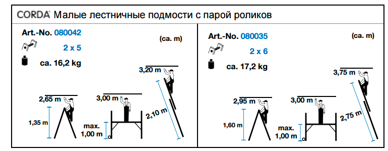 Подмости лестничные 6 ступеней, рабочая высота 3,75м, длина платформы 1,6м CORDA KRAUSE