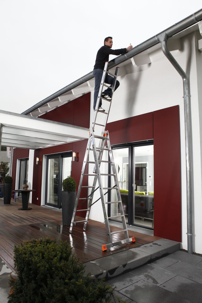 Трехсекционная универсальная лестница используется как приставная или выдвижная лестница, а так же как стремянка с выдвижной частью.