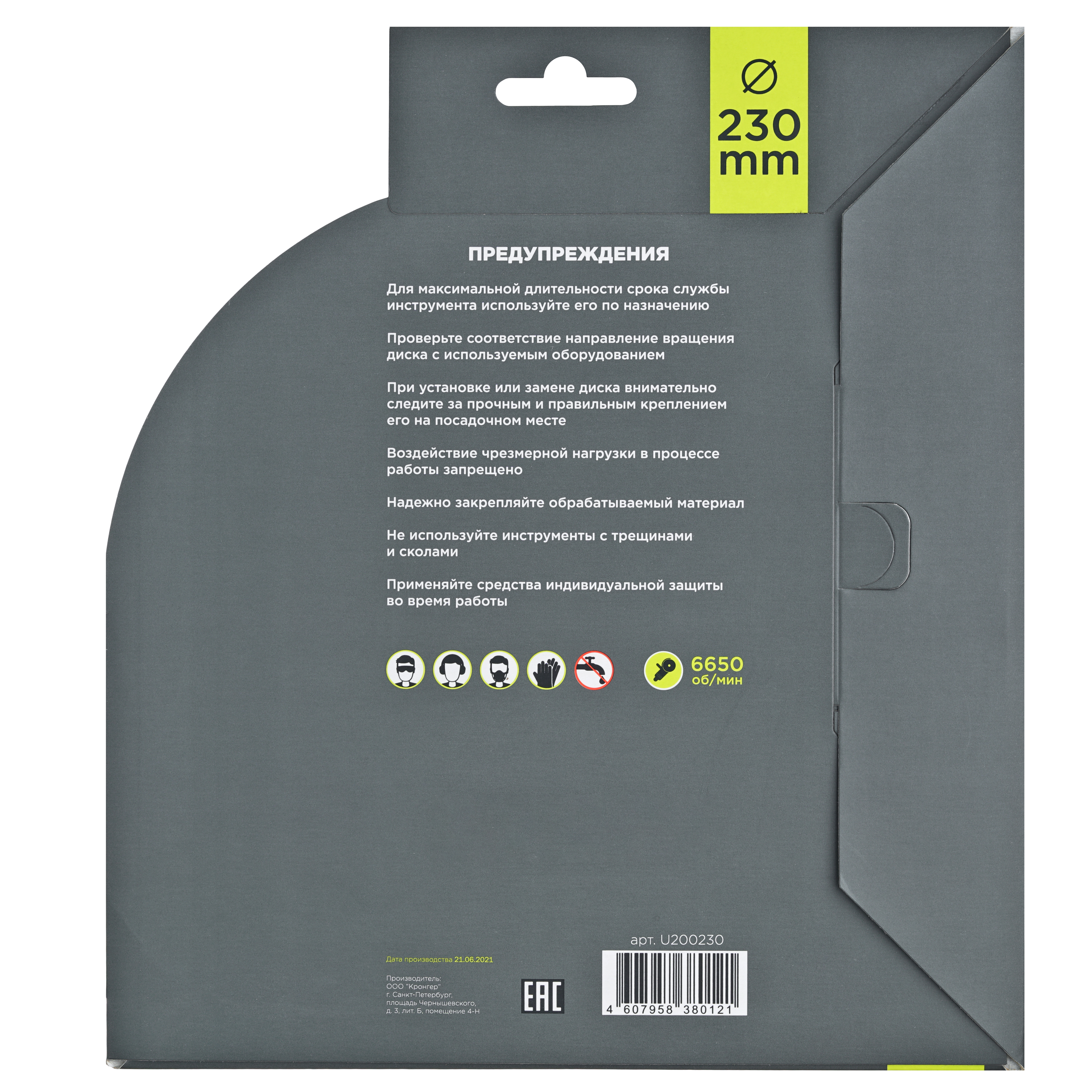 - Диаметр диска 230 мм с посадкой 22,23 мм для болгарки.