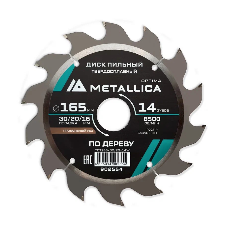 Диск пильный 165х2,4х30/20/16мм 14Z по дереву, для чернового продольного пиления, METALLICA Optima