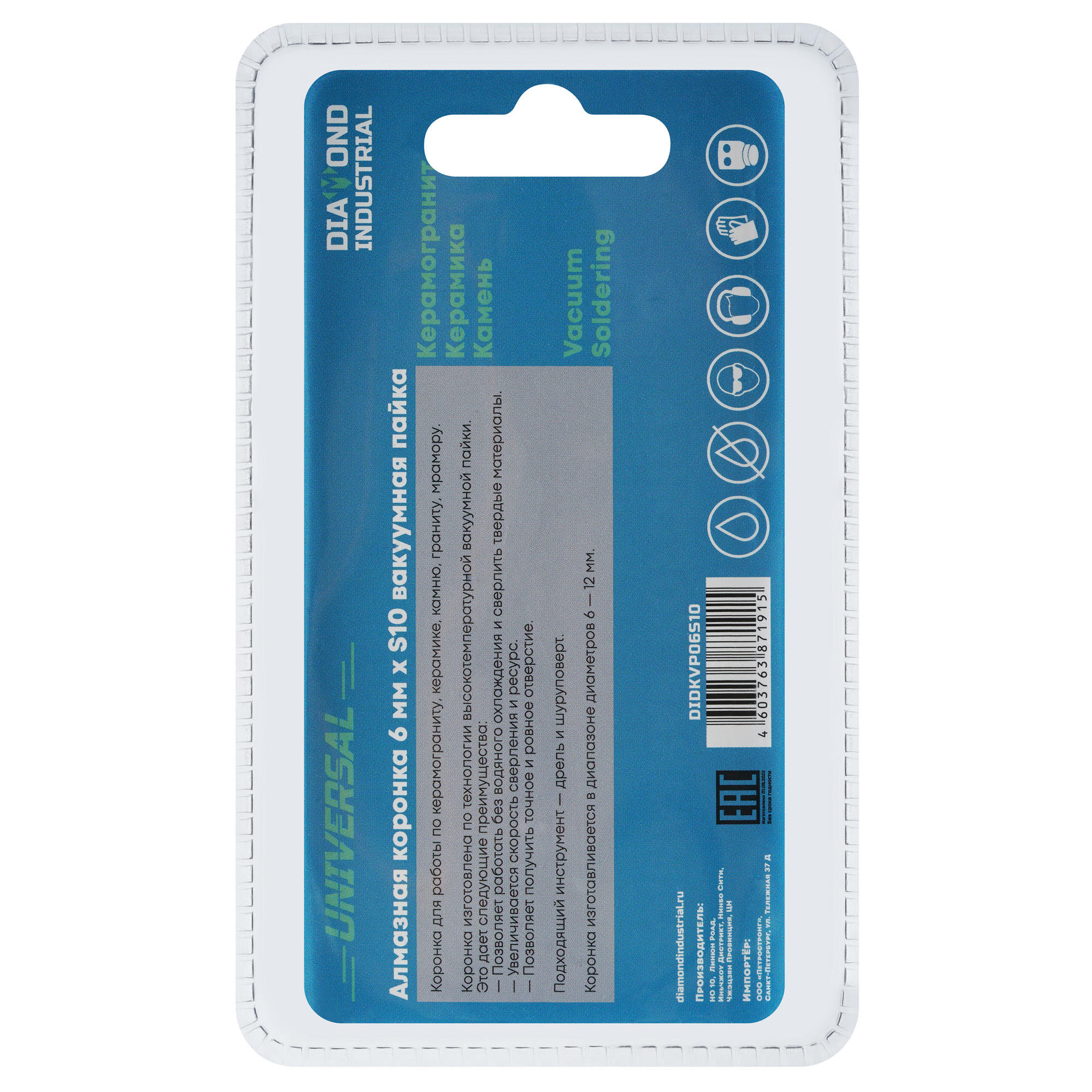 Коронки изготовлены по технологии вакуумной пайки алмазов и предназначены для получения ровных отверстий в твердых материалах: керамогранит, гранит, камень, керамика, кафель, мрамор и т.д.