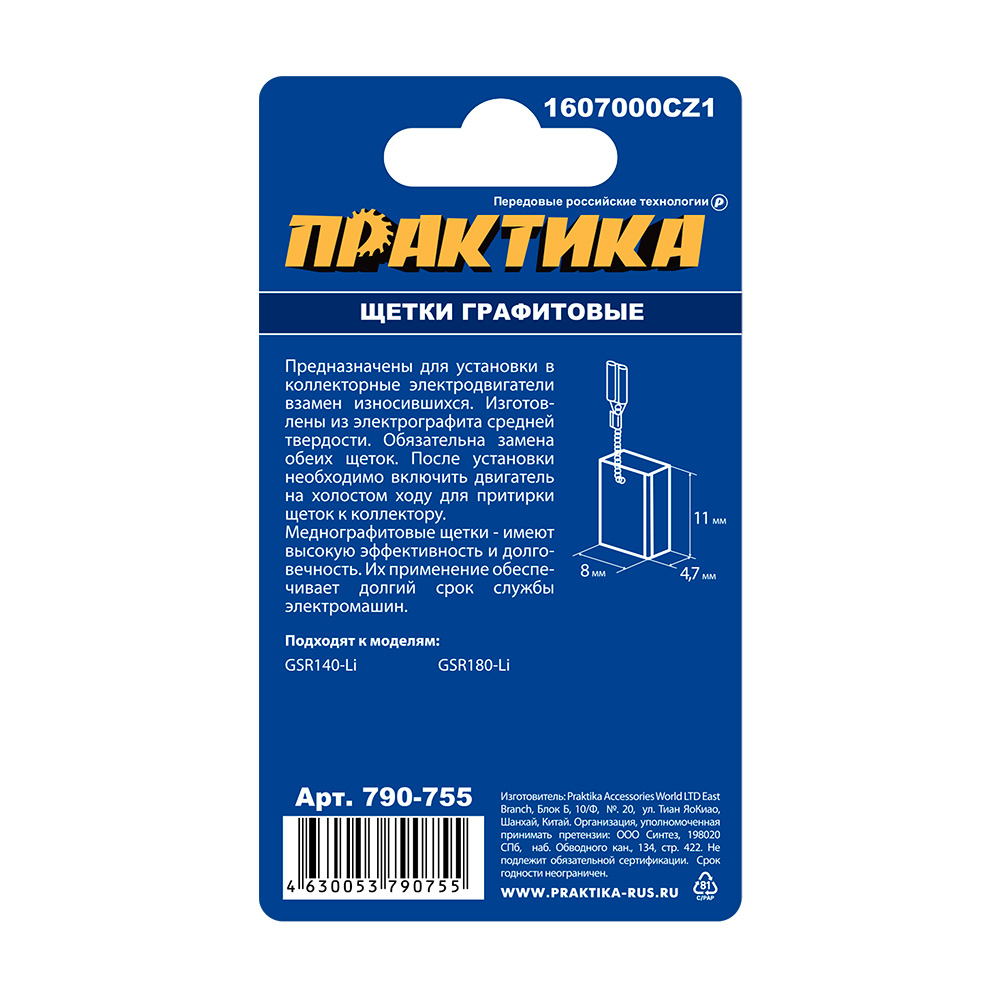 Щетки графитовые для BOSCH №1607000CZ1 с пружиной (4,7x8x11 мм), ПРАКТИКА