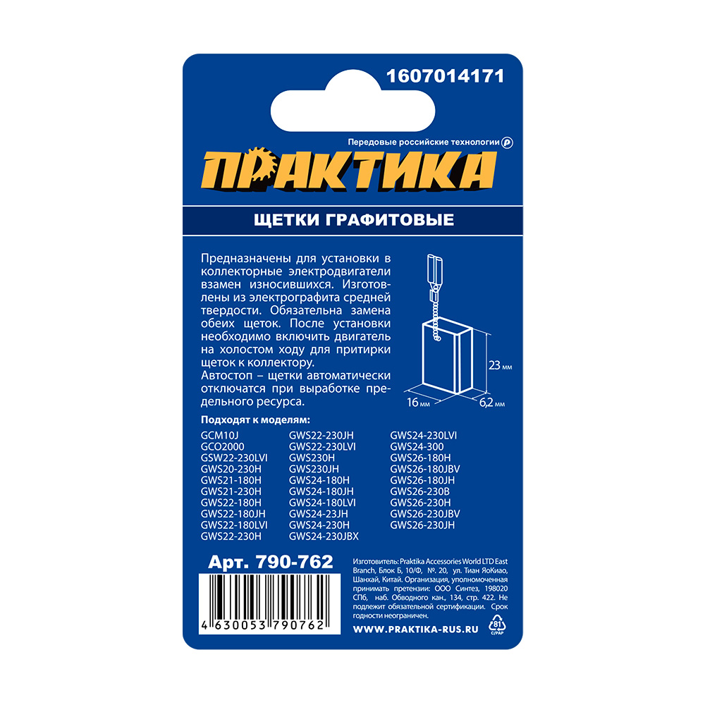 Щетки графитовые для BOSCH №1607014171 (6,2x16x23 мм) автостоп, ПРАКТИКА