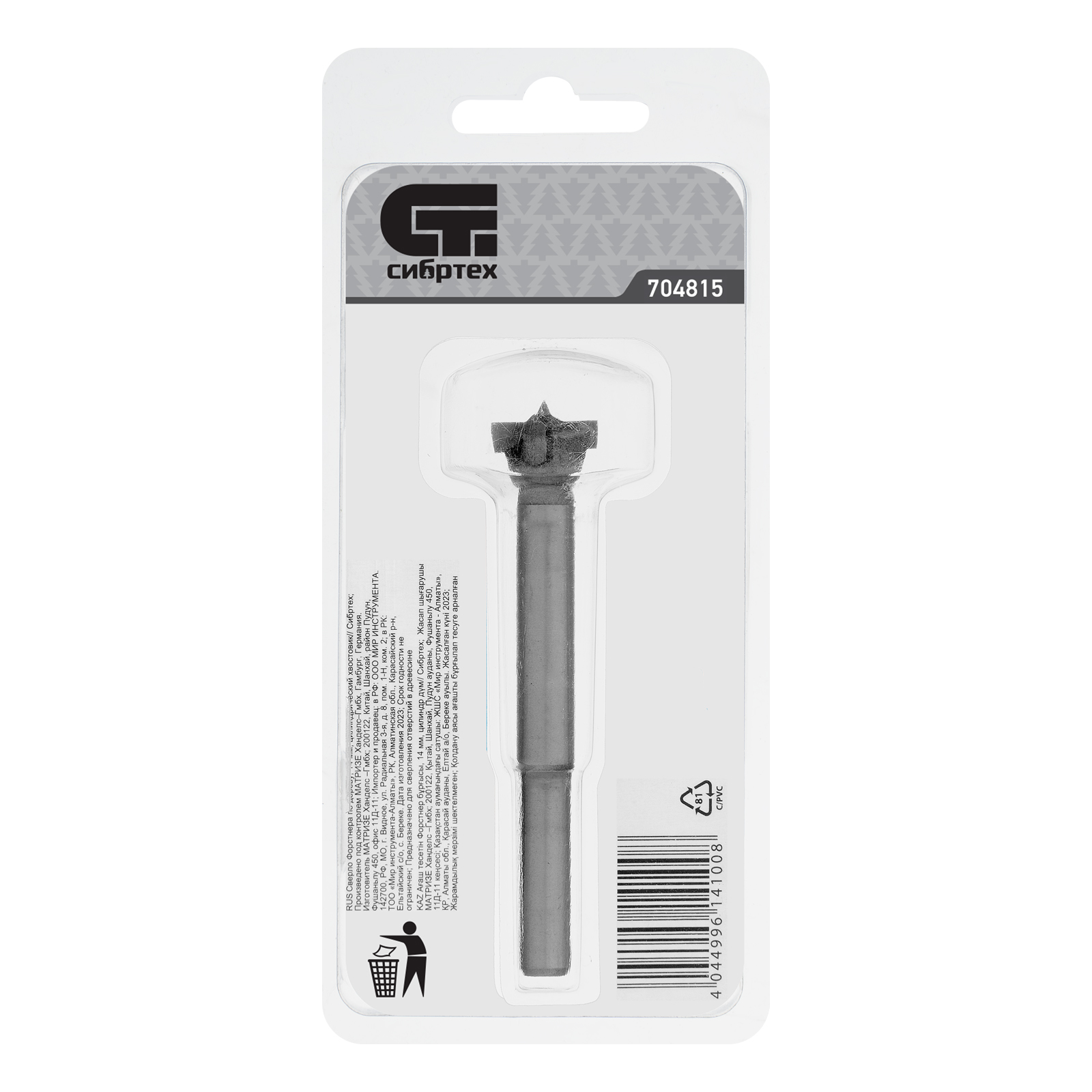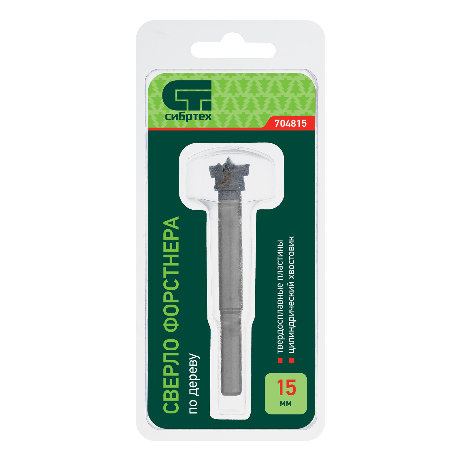 Сверло Форстнера по дереву Сибртех с цилиндрическим хвостовиком, используется для получения глухих отверстий диаметром 15 мм в древесине, ДСП, ДВП и других материалах.