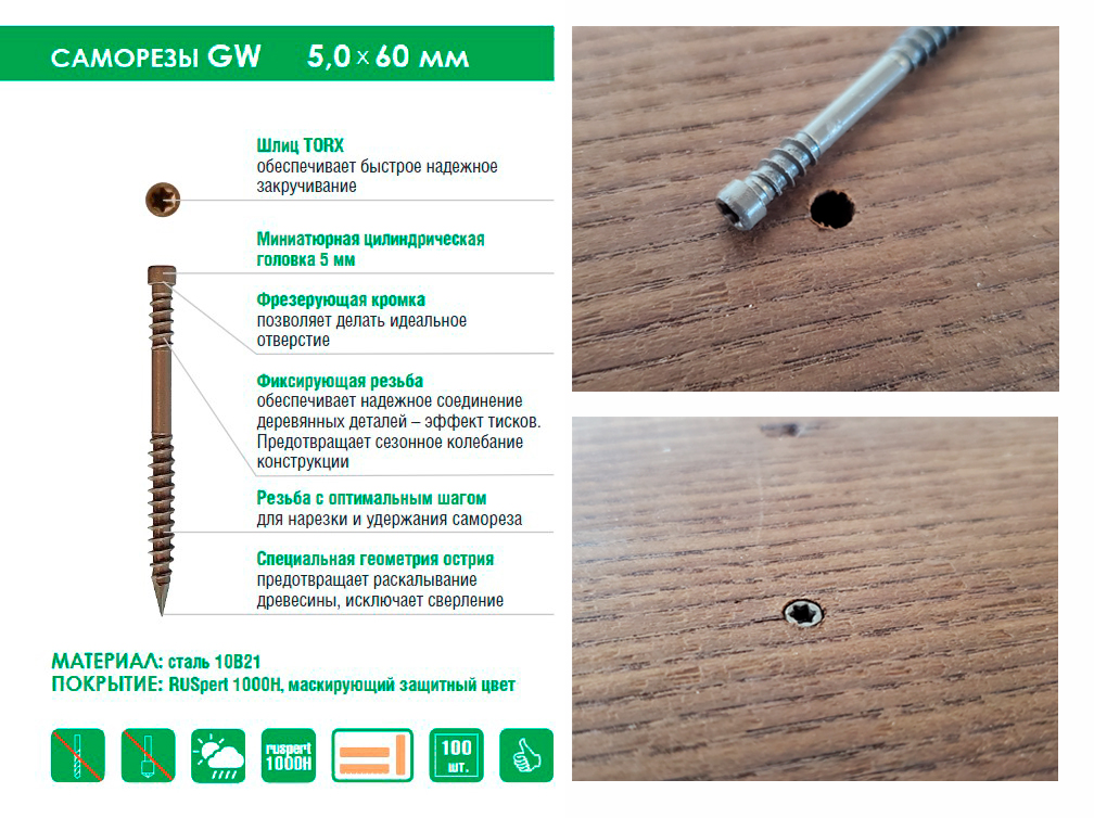 Ограничение! Не рекомендуем применять террасные саморезы Русперт 1000 в коммерческих банях и саунах. При наличии Вашего желания осуществить непрофильное применение метизной продукции просим провести тестовое использование и самостоятельно убедиться в правомочности Ваших предположений.