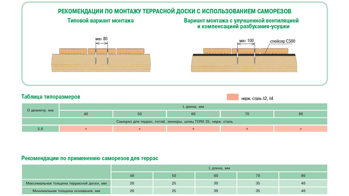 Террасные саморезы предназначены для крепления гладкой или рифленой террасной доски из древесины на подготовленное ровное деревянное основание.