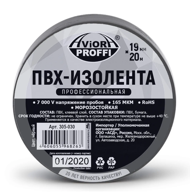 Изолента 19мм*20м черная профессиональная, AVIORA