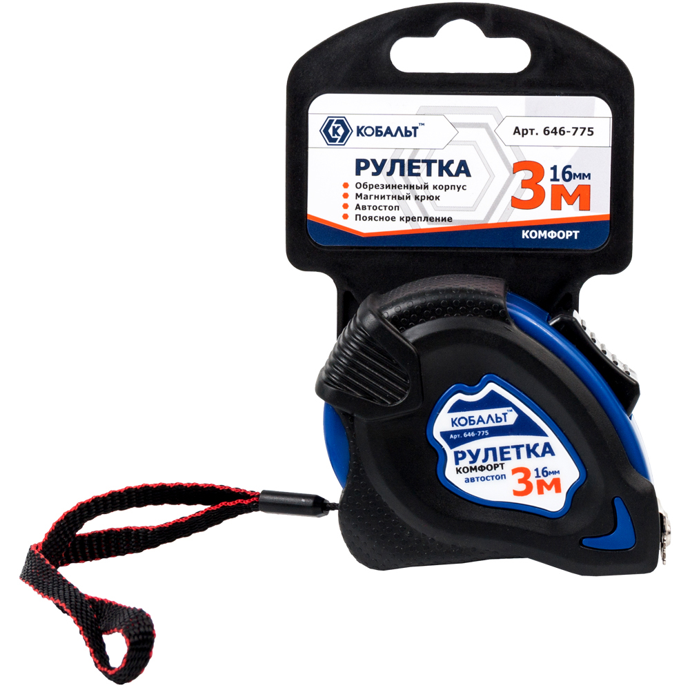 Рулетка 3м*16мм обрезиненный корпус, магнитная, автостоп, КОБАЛЬТ