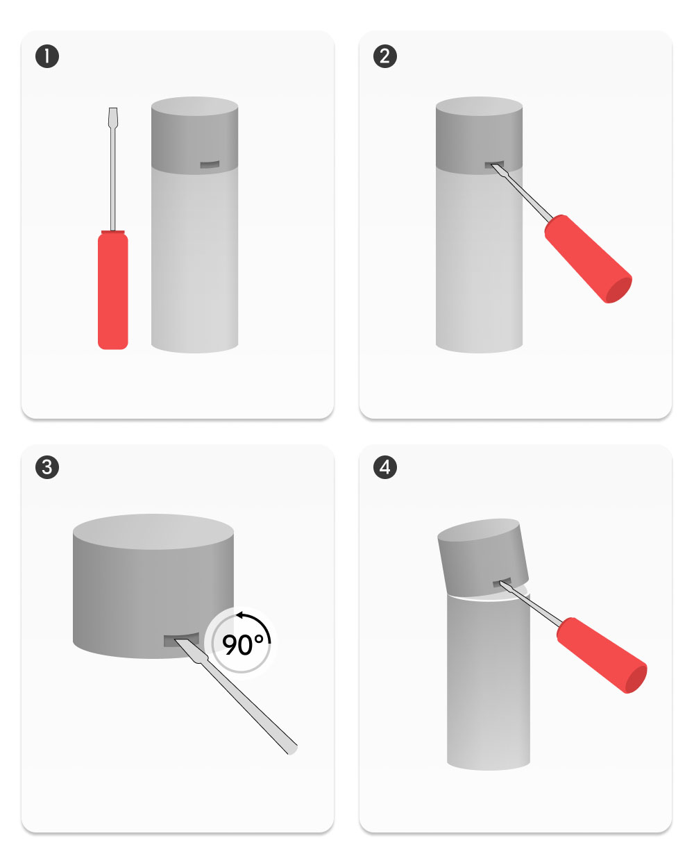 - Снять колпак с баллона. Для этого вставить в отверстие в колпаке шлицевую отвёртку с шириной лопатки 7–10 мм. Провернуть отвёртку на четверть оборота, опираясь лопаткой на ребро баллона. Не вставлять отвёртку слишком глубоко, чтобы не повредить купол баллона.
