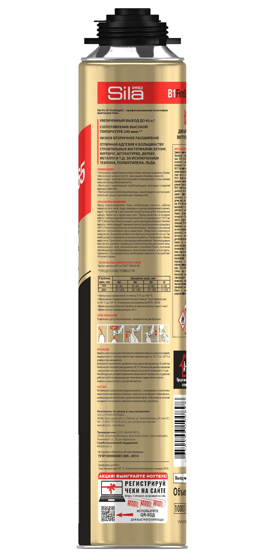 В отличие от обычной пены, которая горит, монтажная пена Sila Pro B1 Firestop затухает, что позволяет ей сдерживать воздействие пламени на протяжении 240 минут. В критической ситуации при возгорании помещения, проемы и щели, заполненные огнестойкой пеной Sila Pro B1 Firestop, не станут прямым путем распространения огня, что задержит пожар, распространение угарного газа и облегчит эвакуацию людей. Огнестойкая пена Sila Pro B1 Firestop обладает термостойкостью и увеличенным временем сопротивления огню в течение 240 минут, не воспламеняется и не горит.