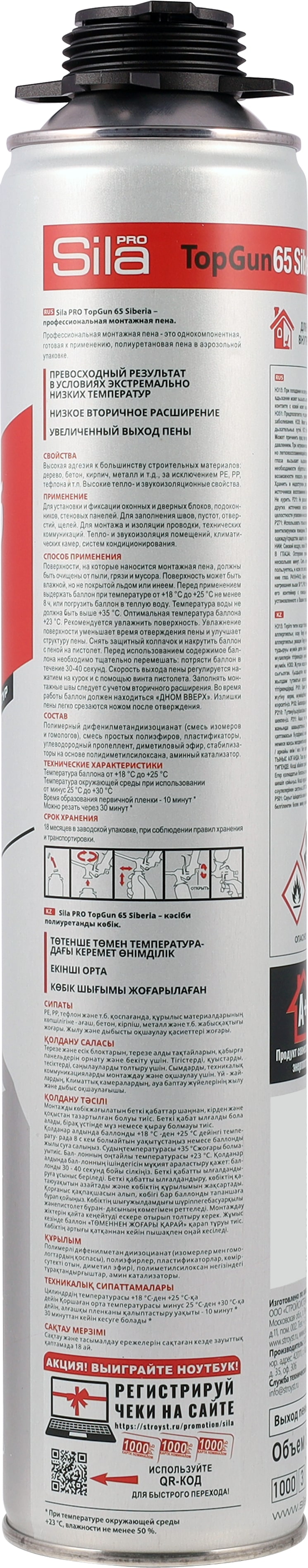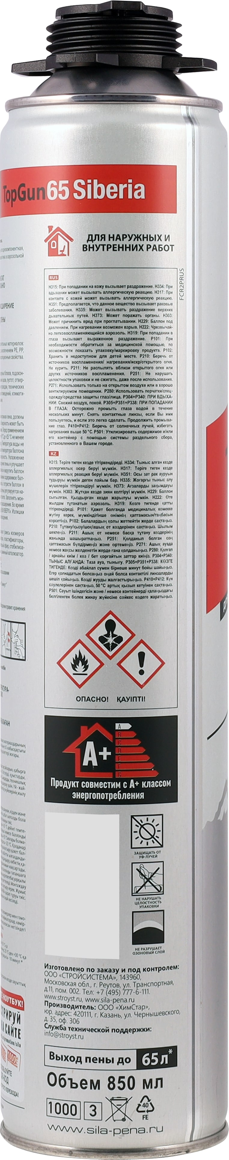 Sila Pro TopGun 65 SIBERIA - уникальная по сочетанию характеристик и потребительских качеств профессиональная монтажная пена, предназначенная для работы в условиях экстремально низких температур от -25℃.