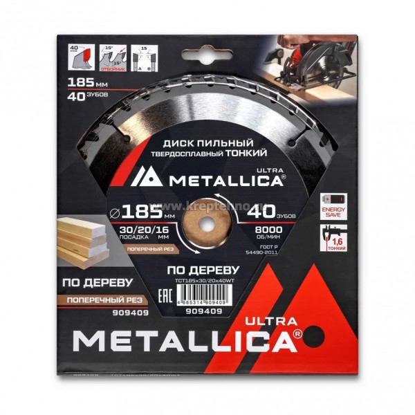 Диск пильный 185х1,6х30/20/16мм 40Z ТОНКИЙ по дереву, для чистого поперечного пиления, METALLICA