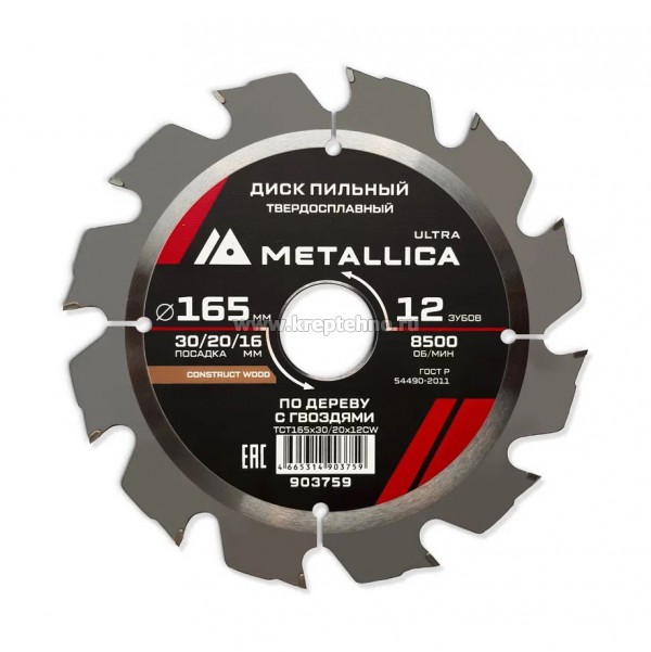 Диск пильный 165х2,4х30/20/16мм 12Z по дереву c ГВОЗДЯМИ для быстрого чернового пиления, METALLICA Ultra