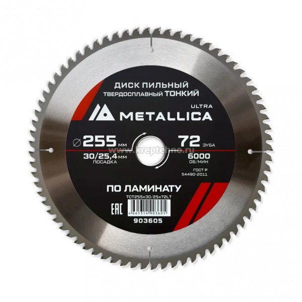 Диск пильный 255х2,0х30/25,4мм 72Z ТОНКИЙ по ламинату, для чистого пиления, METALLICA Ultra